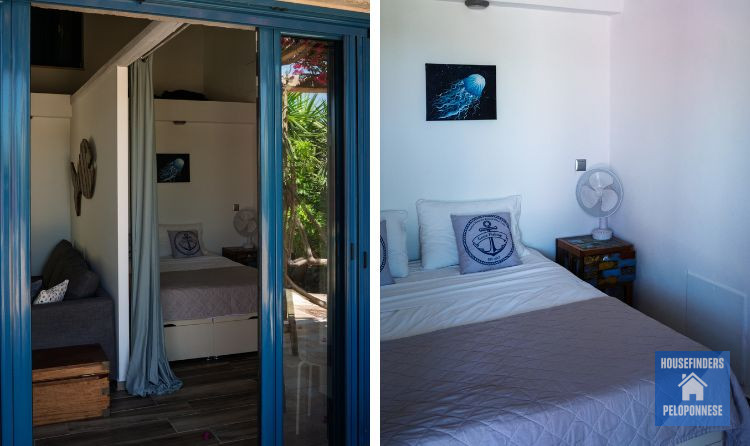 En underbar och väldesignad fastighet. I en stor olivlund, byggdes året 2017 de tre små stugorna. Varje hus är på 37 m2 och poolen är på 32 m2. På området finns även utomhusbar och en lekplats för barnen. Varje stuga är en studio med en bekväm sovplats, en bäddsoffa i vardagsrummet samt ett mindre kök och egen altan. Nära till varandra men med ett ”eget liv”.